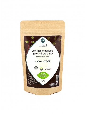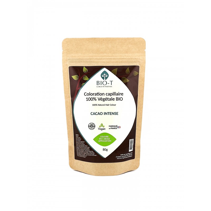 Découvrez la Coloration végétale MONO-APPLICATION Cacao Intense de BIO-T, une coloration végétale fabriquée en France, 100% naturelle, riche en plantes colorantes. Sa texture crémeuse et sans grumeaux s'applique facilement.