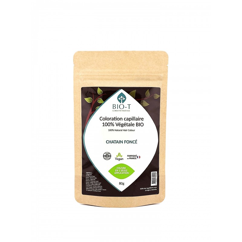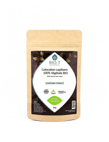 Découvrez la Coloration végétale MONO-APPLICATION Châtain Foncé de BIO-T, une coloration végétale fabriquée en France, 100% naturelle, riche en plantes colorantes. Sa texture crémeuse et sans grumeaux s'applique facilement.